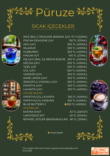 PÜRUZE CAFFE’ye hoş geldiniz. Kahvenin kokusunu, kahvaltı çeşitlerimizi, tatlı ve yemeklerimizin lezzetiyle buluşturduğumuz bu mekanda amacımız, kendinizi iyi hissettiğiniz anlar yaratmak. Burası, yıllar önce Kuzguncuk’ta çekilmiş Ekmek Teknesi dizisine ev sahipliği yapmış, mahalle ruhunun sıcaklığını hala taşıyan özel bir yer. Bugün bu atmosferi, özenle hazırladığımız ürünler ve samimi ekibimizle modern bir dokunuşla sizlere sunuyoruz. Keyifli bir deneyim için her zaman yanınızdayız.